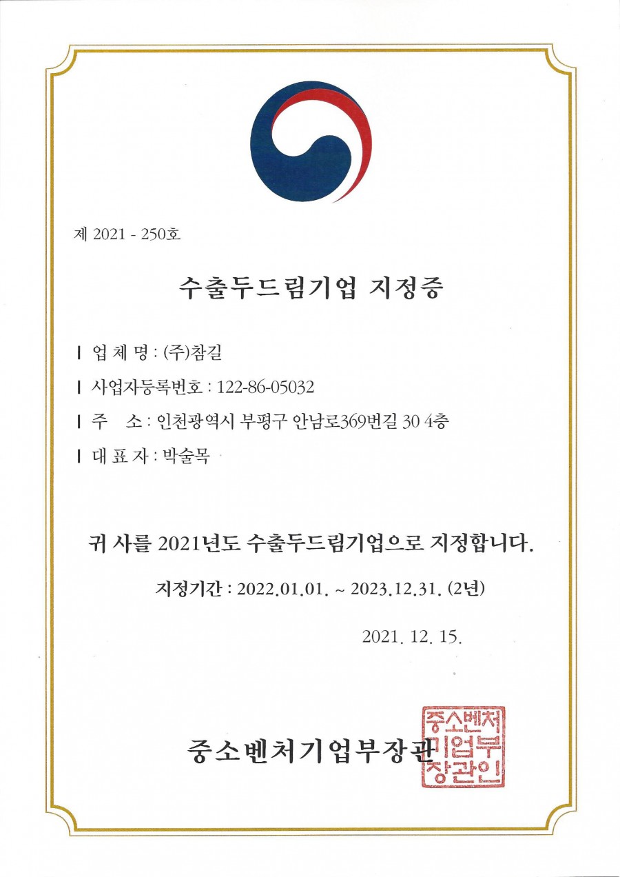 참길 수출두드림기업지정증 페이지 정보 작성자 최고관리자 작성일22-01-13 15:04 조회28,883회 댓글0건 관련링크 본문 저희 참길이 수출두드림기업에 지정되었습니다. 댓글목록 등록된 댓글이 없습니다. 이전글 다음글 목록