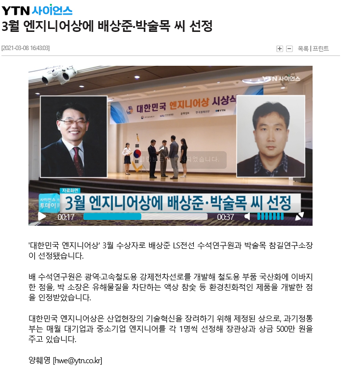 "대한민국 엔지니어상" 2021년3월 수상 선정 보도자료 (ytn사이언스 영상 보도자료) 페이지 정보 작성자 최고관리자 작성일21-03-10 13:50 조회32,248회 댓글0건 관련링크 본문 ■ ytn사이언스 영상 보도자료 ■ 댓글목록 등록된 댓글이 없습니다. 이전글 다음글 목록